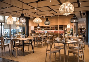 Das Interieur im Restaurant KAORI ist schlicht und in hellem Holz gehalten. Filigrane Leuchten und verschieden hohe Tische vermitteln ein angenehmes Ambiente, welches auf die puristische Küche Japans abgestimmt ist.